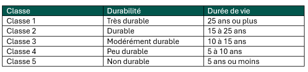 Il existe cinq classes de durabilité :
