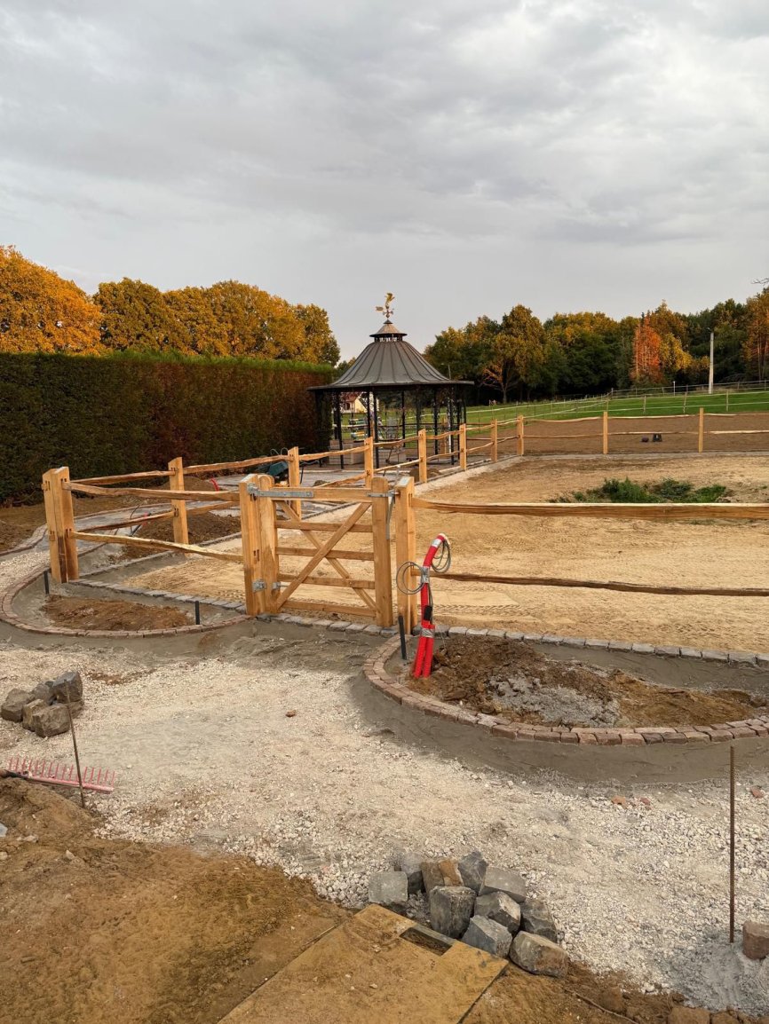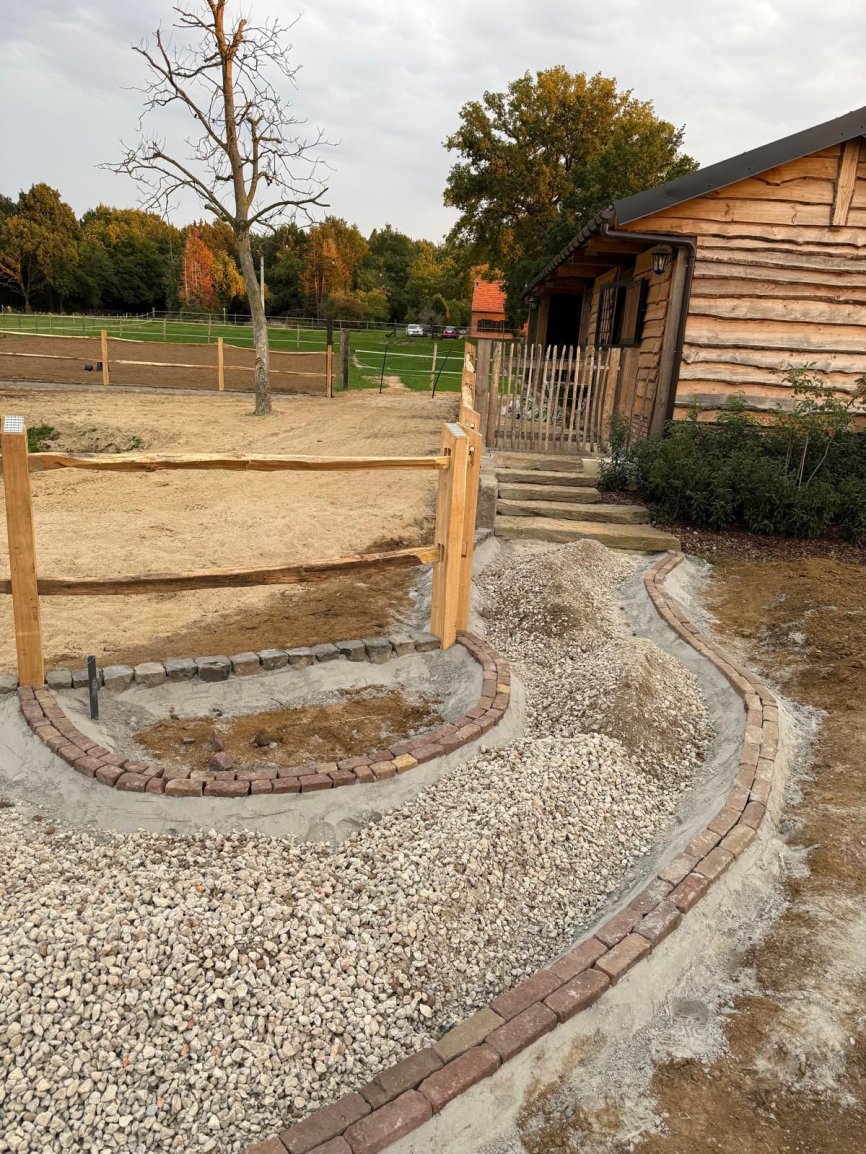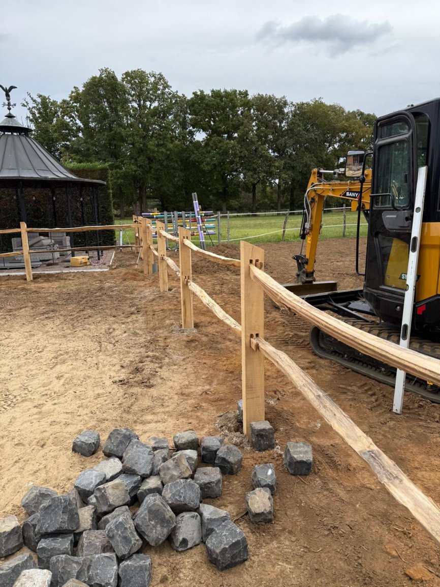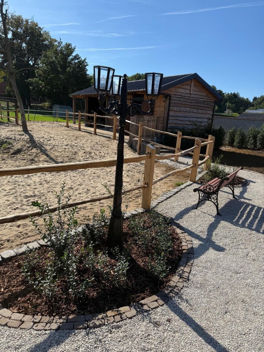 Natuurlijke afrasteringen & omheiningenAangeleverd door ‘t Kempisch Domein en geplaatst door de klant. Deze tuinaannemer koost voor onze gekloven Robinia Post&Rail om een paardenpaddock af te werken. Daarna plaatste hij naadloos de tuin en verharding, waardoor het geheel er verzorgd en natuurlijk uitziet. Dankzij de duurzaamheid van Robinia is het verblijf stevig, weersbestendig en volledig in harmonie met de tuin.