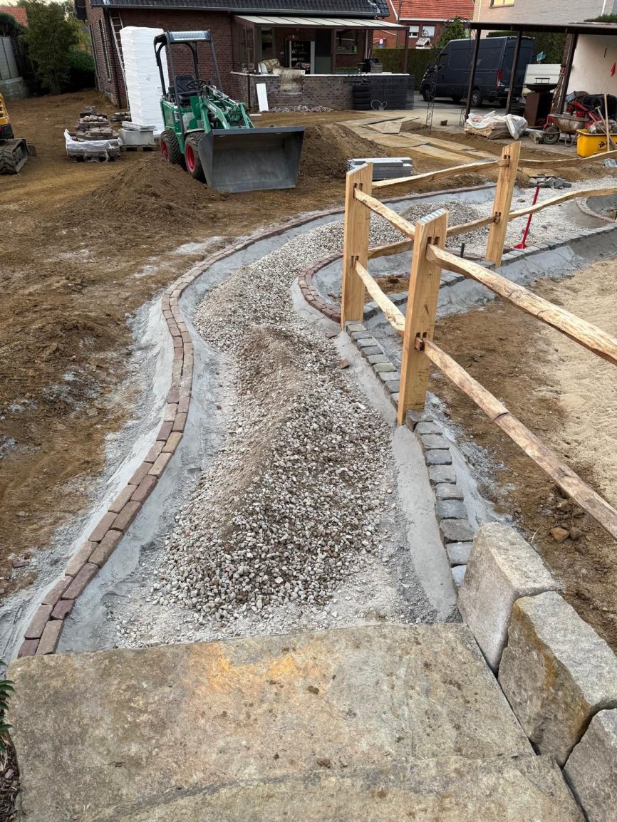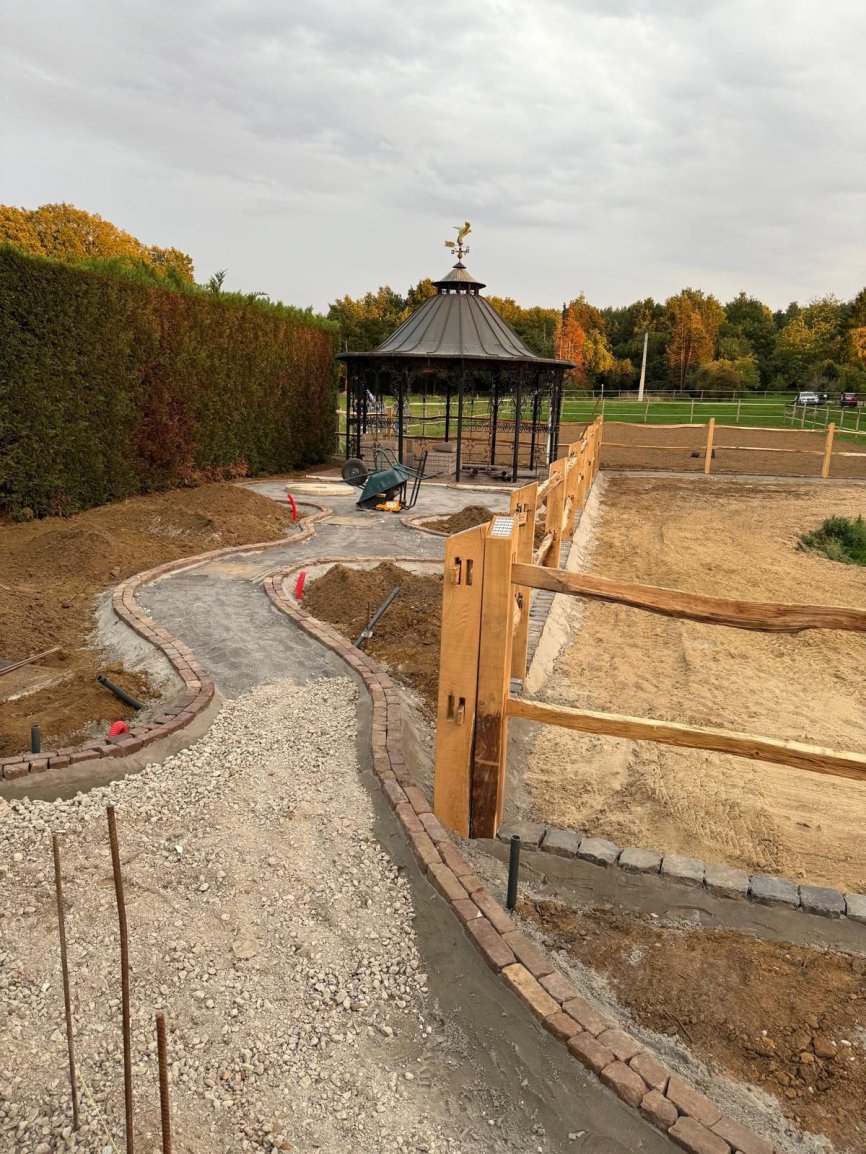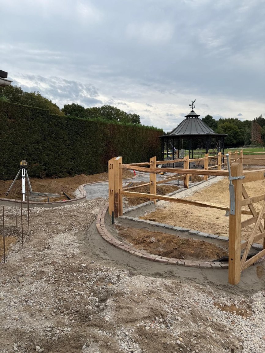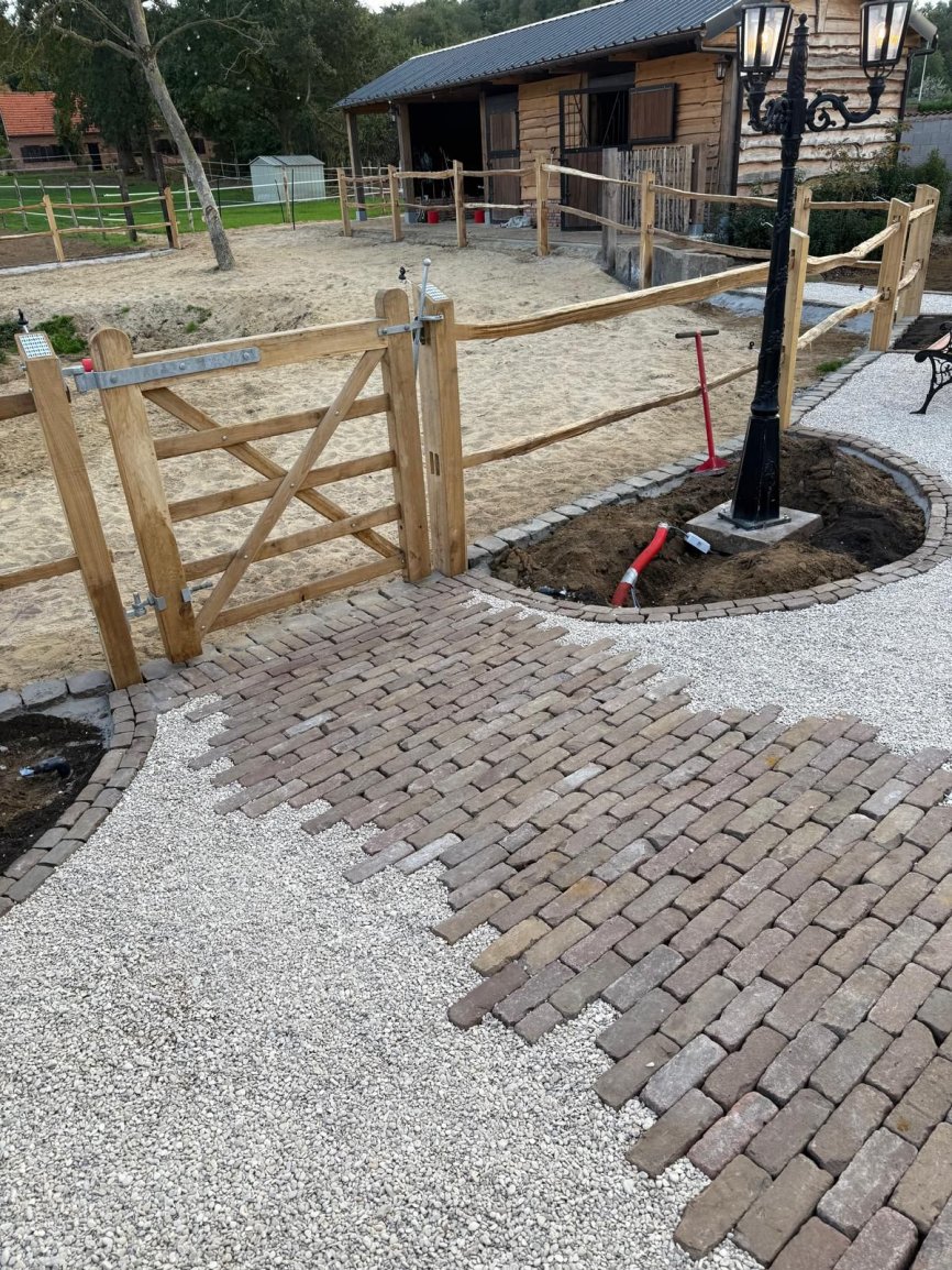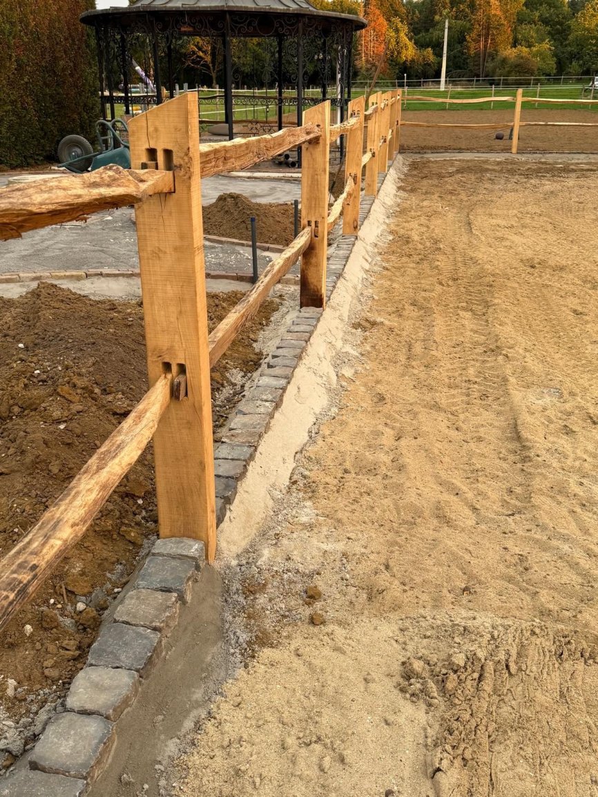 Natuurlijke afrasteringen & omheiningenAangeleverd door ‘t Kempisch Domein en geplaatst door de klant. Deze tuinaannemer koost voor onze gekloven Robinia Post&Rail om een paardenpaddock af te werken. Daarna plaatste hij naadloos de tuin en verharding, waardoor het geheel er verzorgd en natuurlijk uitziet. Dankzij de duurzaamheid van Robinia is het verblijf stevig, weersbestendig en volledig in harmonie met de tuin.